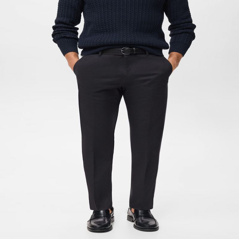 Tejido de algodón. Regular fit. Detalle de raya planchada en la parte delantera y trasera. Cierre delantero de cremallera y botones. Trabillas para cinturón. Dos bolsillos laterales. Dos bolsillos de ribete con botón en la parte posterior.