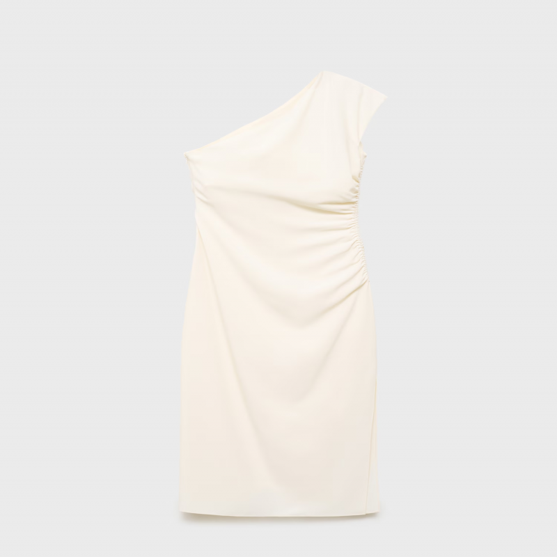Diseño midi. Diseño entallado. Cuello asimétrico. Sin mangas. Fruncido lateral. Abertura lateral. Cierre de cremallera lateral. Forro interior.