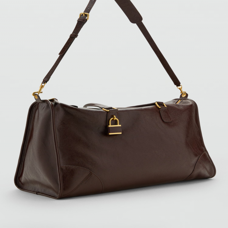 Efecto piel. Acabado brillante. Tamaño grande. Diseño rectangular. Dos asas cortas de mano. Asa larga tipo bandolera desmontable. Cierre de cremallera. Detalle de candado. Forro interior.